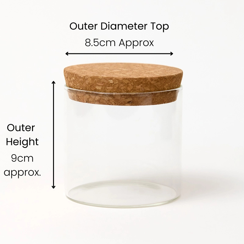 The 30cl Flat Cork Glass Jar features a clear, straight-sided design made from high borosilicate glass and finished with a flat cork lid. The simple shape and natural cork closure give this jar a clean, understated appearance suitable for a variety of candle styles.