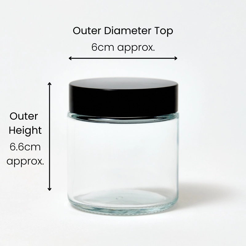 The Clear Glass Jar with Lid – 100ml features a compact, straight-sided design with a clear glass body and contrasting black lid. Its simple, clean appearance makes it suitable for a wide range of candle and small container applications.