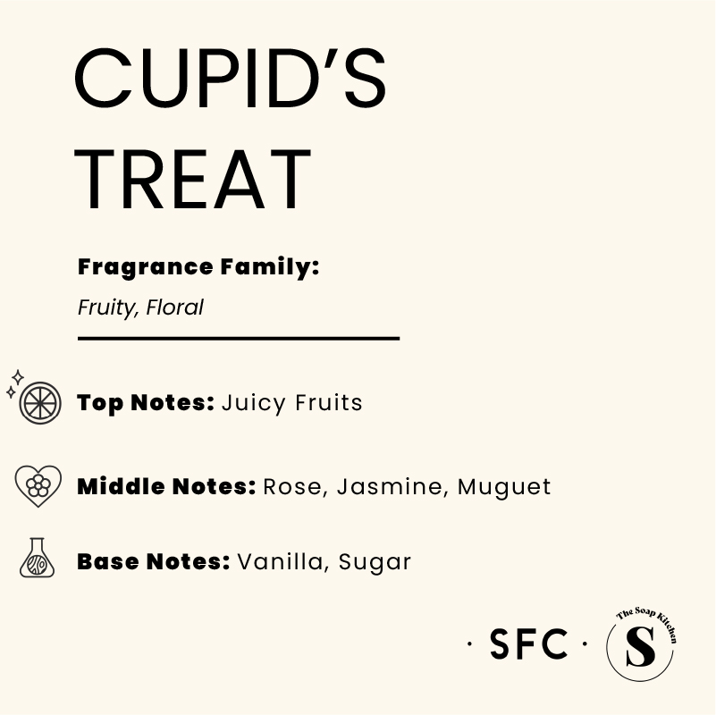 What Our Perfumer Says About Cupid’s Treat Fragrance Oil “Cupid’s Treat is my ode to love’s most delightful moments. Inspired by the first spark of attraction, the fragrance begins with a playful burst of juicy fruits while the heart blooms with a romantic blend of rose, jasmine, and muguet. Finally, to evoke the comforting warmth of an embrace, I wrapped it all in a soft, indulgent base of vanilla and sugar.”