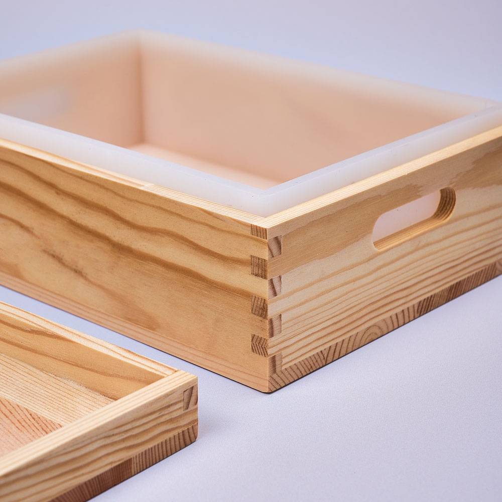 Our Soap Mould with Silicone Lining, 2kg, Rectangle, is a reliable and reusable mould, perfect for creating larger batches of soaps, shampoo bars, lotions bars and more. With a wooden casing and silicone lining, this bulk soap making mould is easy to use and high-quality.