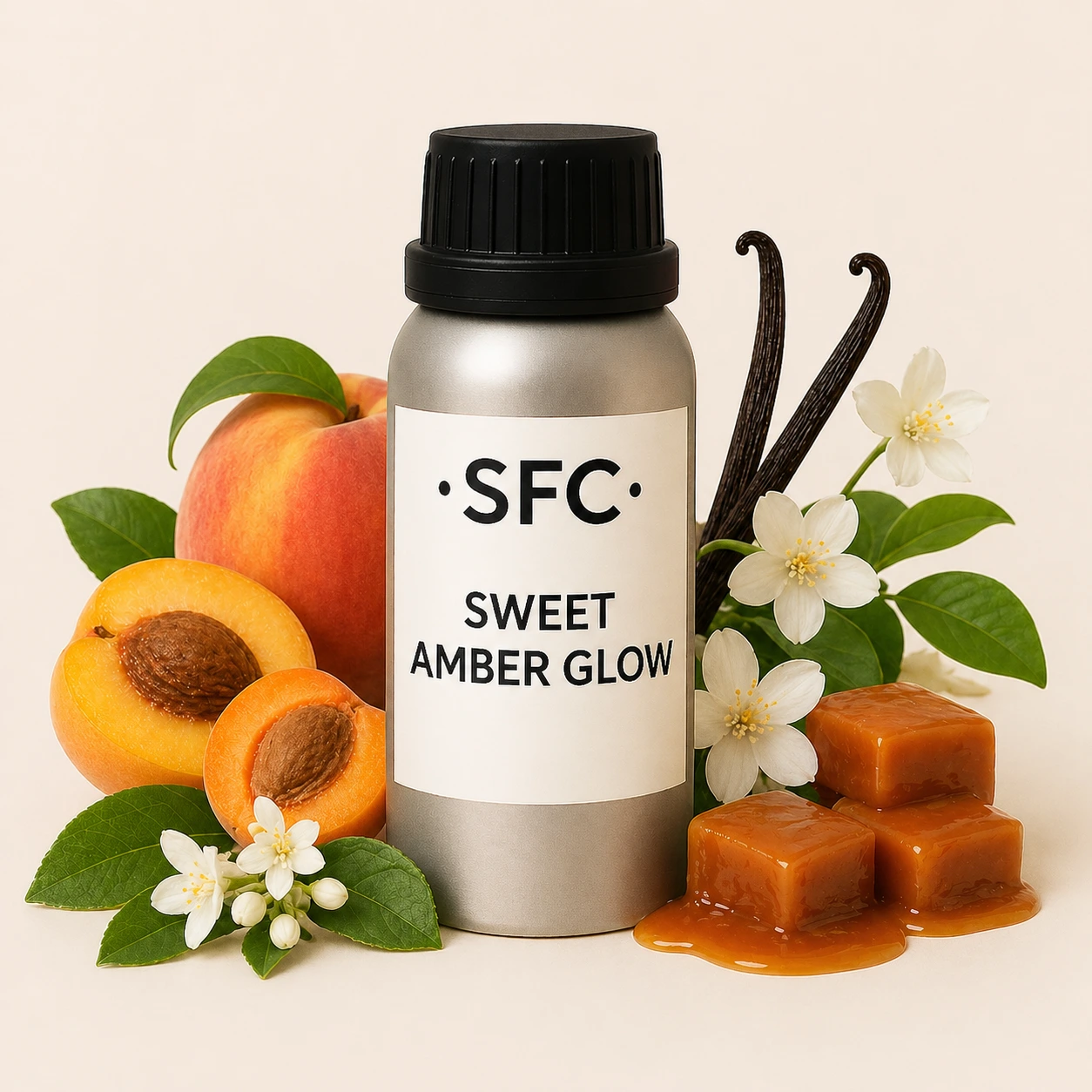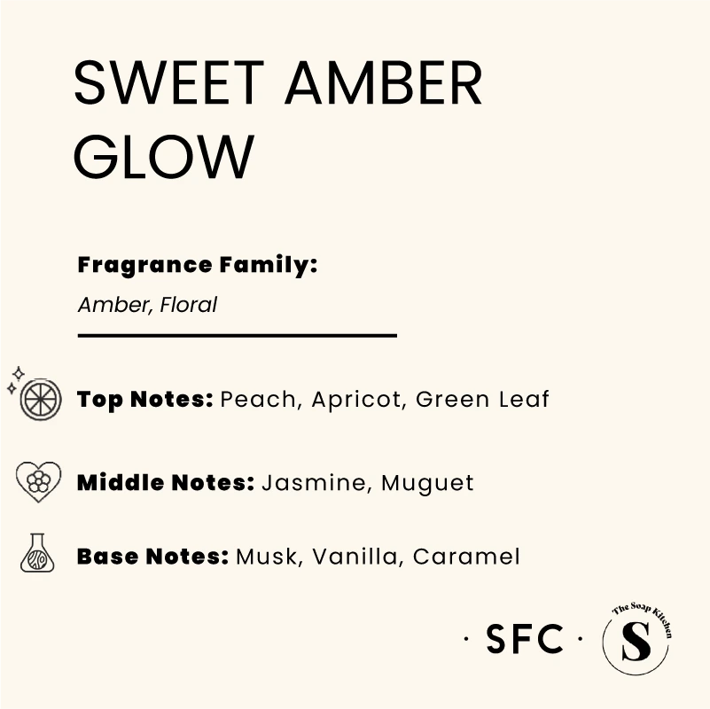 What Our Perfumer Says About Sweet Amber Glow Fragrance Oil – “I wanted Sweet Amber Glow to feel like that moment when the sun’s going down and everything feels warm and easy. I started with juicy peach and apricot because they’re playful and comforting, then added a touch of green leaf to keep it light and fresh. Soft jasmine and muguet give it a gentle floral hug, and the musk, vanilla and caramel base wraps it all up in a creamy, sweet glow that just lingers beautifully.”